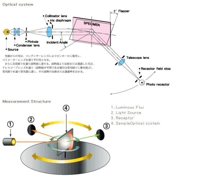 입사각과 수광 각도가 각각 독자적으로 변각 수 물질에 빛을 쬐어 그 반사 또는 투과광의 강도 분포 상태를 분석함으로써 그 물질 만이 갖는 광학적 정보를 도출 할 수 있기 때문에 광학 모양의 연구에 필수적인 장비입니다. 계산을위한 처리 장치와 계산 결과를 그래프화 하는 프로그램, 각종 옵션 시료대가 있습니다.