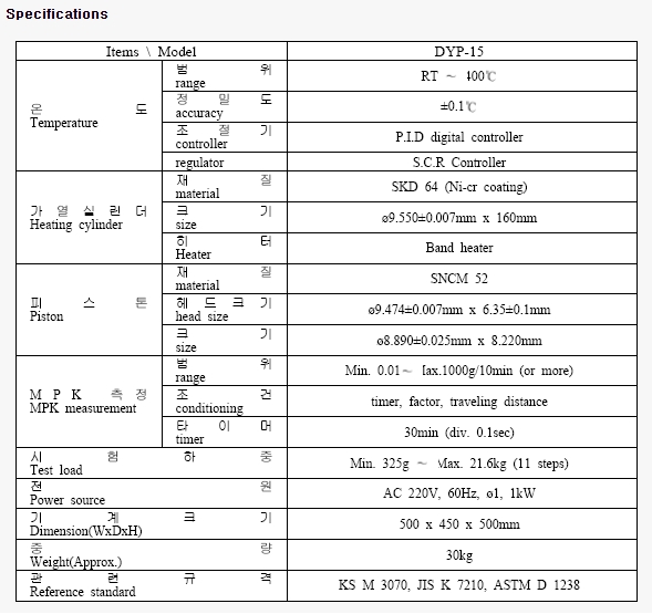 본 시험기는 열가소성 플라스틱의 용융 유동성을 측정하기 위해 제작된 기기로서, 규정된 온도와 압력조건하에서 용융된 열가소성 플라스틱을 규정된 길이와 지름의 다이(Die)를 통하여 압축 시켰을 때 압축 속도를 측정하는 구조로 되어있으며, 또한 이 시험방법에는 MELT FLOW RATE 지수에 따라 A법, B법으로 구분되며, 그 기준은